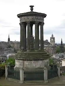 في عام 1831، وبإشعار عام كبير، أقامت المدينة نصبًا تذكاريًا في كالتون هيل.[7] هذا حسب تصميم وليام هنري بلايفير، وهو يحتل موقعًا رائدًا في أفق المدينة مشكلًا أحد معالم المدينة الشهيرة.[17] كُرّمت ذكراه أيضًا بمبنى «دوغالد ستيوارت» (الذي شُيّد عام 2011) في جامعة إدنبره لإنشائه قسم الفلسفة التابع لها في شارع تشارلز، قبالة ساحة جورج.