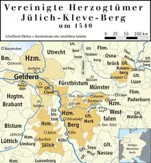 خريطة يوليش كليفه برغ تشمل مقاطعة خيلدرلند (حوالي العام 1540)