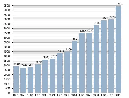 في سنة 1861 بلغ عدد السكان 2٬904 نسمة، وتطور العدد ليصل في سنة 2011 لـ 9٬404 نسمة.
