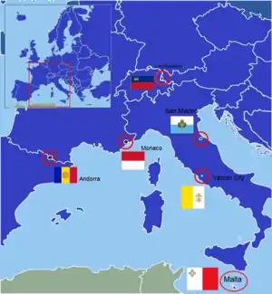 | سان مارينو – جمهورية سان مارينو | مدينة سان مارينو | 61 كـم2 (24 ميل2) | ||