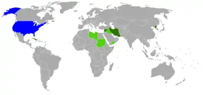 الدول الحالية في القائمة هي إيران ثم سوريا. ثم كوبا موخرآ بدأ إصدار القائمة في 29 ديسمبر/كانون الأول من عام 1979 وضمت حينها العراق واليمن الجنوبي ثم سوريا فليبيا (كلها دول عربية). أضيفت كوبا في 1 مارس من عام 1982 ثم إيران في 19 يناير 1984، وبعدها كوريا الشمالية في 1988 في . أزيل اليمن الجنوبي من القائمة في عام 1990 وتبعه العراق في 2004، وليبيا في 2006 ثم كوريا الشمالية في 2008، وكوبا في 2015.