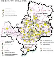 تغطي منطقة حوض دونباس أقاليم أوبلاستس شرق البلاد، وهو الجزء الواقع أقصى الشرق دنبروبيتروفسك أوبلاست حول مدينة بافلوراد (ما يُسمى بدونباس الغربية) الجزء الشمالي والأوسط من دونيتسك أوبلاست (الجزء الجنوبي يُعرف بمنطقة برايزوفيا الساحلية والجزء الجنوبي من لوهانسك أوبلاست يُعرف الجزء الشمالي بمنطقة سلوبوزانشينا. تُعد مدينة دونيتسك العاصمة غير الرسمية (السياسية) لدونباس.