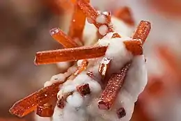 ![]() دونداسات (المعدن الأبيض) وكروكويت من دونداس في تسمانيا. مجال الرؤية هو 5 ملم. | |