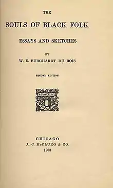 في محاولة لتصوير عبقرية وإنسانية الجنس الأسود، نشر دو بويز كتاب أرواح الشعب الأسود (وهو مجموعة من 14 مقال) عام 1903.[54] كان تأثير هذا الكتاب على الأميركان الأفارقة، وفقاً لجيمس ويلدون جونسون، مشابهاً لتأثير كتاب كوخ العم توم.[55] أعلن دو بويز في مقدمة الكتاب الشهيرة أن "مشكلة القرن العشرين هي مشكلة حد اللون".[56] في بداية كل فصل وضع اقتباسان، واحدة من شعر البيض وواحدة من الحياة الروحية للسود، وذلك كدليل على المساواة الفكرية والثقافية بين ثقافة البيض والسود.[57] كانت الفكرة الرئيسية للكتاب هي الوعي المزدوج الذي يواجه الأميركان الأفارقة: مكانتك كمواطن أميركي أسود تعتبر هوية فريدة من نوعها، وفقاً للويس، ففي الماضي كانت عائقاً ولكن في المستقبل يمكن أن تكون مصدر قوة: "من الآن فصاعداً يمكن تصور مصير الجنس الأسود كروّاد ليس للانصهار ولا للعزلة ولكن ليكونوا دائماً فخورين بالهوية المزدوجة".[58]