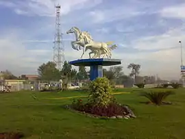 في اتجاه عقارب الساعة من الأعلى: تمثال خيول مشهور في المدينة، ضريح غازي خان (سُمّيت المدينة باسمه)، مطار ديرا غازي خان الدولي | |||||
