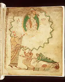 ديرك وزوجته يتوسلان للقديس أدالبيرت كي يشفع لهم عند السيد المسيح، في أنجيل إيغموند