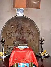 النهاية الشرقية للكنيسة مُقسَّمة بواسطة فاصل جداري إلى هيكلين، تغطي سقف كلٍ منهما قبة صغيرة، وكلاهما يحتوي على مذبح أعلاه لوح رخامي مستطيل الشكل.[46]