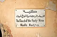 هي كنيسة التسعة والأربعين شهيداً شيوخ شيهات أو شيهيت، أقيمت هذه الكنيسة تذكاراً لاستشهاد الشيوخ الذين ذبحهم البربر مع رسول الملك وابنه خلال غارتهم الثالثة على أديرة وادي النطرون عام 444.[99] وهي من طراز الكنائس القصيرة مثل كنيسة أباسخيرون. وتتكون من مدخل مسقوف يشغل الزاوية الجنوبية الغربية، ثم يوجد صحن يليه خورس موازٍ له، وإلى الشرق من الخورس يوجد هيكل واحد فقط. ويتصل بالكنيسة من الزاوية الجنوبية الشرقية برج جرس صغير.[100] يُغطي صحن الكنيسة قبو نصف أسطواني مُدعَّم بدعامة -عقد- واحد مستعرض، وينتهي من الشمال بحاجز خشبي، ترتفع خلفه الأرضية مكوّنة مصطبة يرقد تحتها رفات التسعة وأربعين شيخاً. ويفصل الصحن عن الخورس من الشرق أربع صفوف عقود -أربع بواكي (باكيات)-، وفوق كل باكيتين قبو نصف أسطواني. ويغطي الخورس أيضاً قبو نصف أسطواني فيما عدا المساحة المقابلة للهيكل حيث تغطيها قبة محمولة على عقدين مستعرضين فوق العمودين الأول والثاني على الحائط الشرقي للخورس.[101]