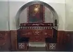 هناك حائط عرضي يفصل الخورس عن باقي الكنيسة، ويتخلله ثلاث فتحات لتهيئة الثلاث مداخل المؤدية إلى الخورس. أما الدهليز الغربي فاتساعه أقل من اتساع الكنيسة، وله أيضاً حاجز عرضي. ويرتفع هيكل الكنيسة درجة واحدة عن الخورس، وتغطيه قبة نصف كروية من الطوب الأحمر محمولة على قاعدة من الخشب مثمنة الشكل تستند جزئياً على عمودين رخاميين ملتصقين بالجدار الشرقي للهيكل.[114] ومذبح الهيكل مُزوَّد بلوح رخامي من الطراز الذي يجمع بين المربع ونصف الدائرة. وقبالة الجدار الجنوبي للهيكل يوجد صندوق خشبي كبير -حديث الصنع- لحفظ مقتنيات القديسين.[115]