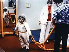 في عام 1977، استخدم باحثون من ناسا تجربتهم في تصنيع بدلات الفضاء في تطوير بدلةٍ خاصةٍ من شأنها أن تسمح لديفيد بالخروج من الفقاعة والمشي في العالم الخارجي. كانت البدلة متصلةً بفقاعته عبر أنبوبٍ قماشي طوله 2.5 متر (8 أقدام)، وعلى الرغم أن الأمر كان مرهقًا، إلا أنه سمح له بالخروج دون التعرض لخطرٍ جسيم. كان ديفيد في البداية يُقاوم ارتداء البدلة، ولكنه أصبح فيما بعد أسهل في ارتدائها، وعلى الرغم من هذا، إلا أنهُ استخدمها 7 مراتٍ فقط. بعد نموه لم يستخدم أبدًا البدلة التي قدمتها له ناسا.[8]