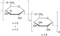 السلسلة المستقيمة تتالف من α-1 ،6 روابط غليكوسيدية بين جزيئات الجلوكوز، بينما الفروع تبدأ من α-1،3 رابطة. (لمعلومات عن عدد ذرات الكربون في الغلوكوز. الديكستران يركب من السكروز من خلال العديد من بكتريا حمض-لبني ،الأكثر شهرة بينها Leuconostoc mesenteroides وعقدية طافرة.