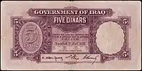 5 دينار وأصدر عام 1932 | أحمر | الملك فيصل الأول | |
