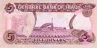 | 5 دينار وأصدر عام 1973 | أحمر | بناية المجلس الوطني | حمورابي يتسلم الشريعة | ||