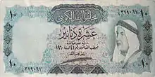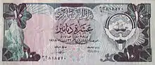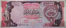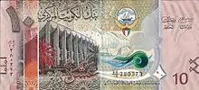 - عشرة دنانير: اللون الرئيسي: برتقالي محمر (الوجة: مجلس الأمة، سفينة السنبوك) (الخلف: رأس صقر، جمل جالس ويحمل السدو في صحراء)