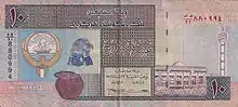 - عشرة دنانير: اللون الرئيسي: الأحمر الداكن (الوجة: الدلو، المسجد الكبير بالكويت ) (الخلف: سفينة المياة التقليدية، مدخل باب كويتي، مشهد لغواصين يبحثون عن اللؤلؤ، مبخرة)