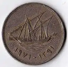 كما أصدر مجلس النقد الكويتي الفئات المعدنية للإستخدام العام وهي تحمل على أحد وجهيها صورة البوم الشراعي الكويتي وسنة الإصدار بالتاريخ الهجري 1380 هـ والميلادي 1961م، أما الوجه الآخر فقد حمل قيمة العملة في الوسط وكلمة إمارة الكويت في الجزء العلوي وكلمة Kuwait في الجزء السفلي، وفيما يلي تفاصيل المسكوكات المعدنية:[2]