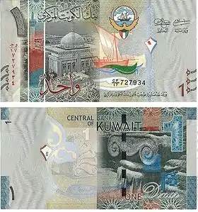 - دينار واحد: اللون الرئيسي: الأزرق المخضر (الوجه: مصباح النفط التقليدي، أبراج الكويت) (الخلف: سفينة تخزين مياة تقليدية، ميناء الشويخ)