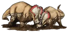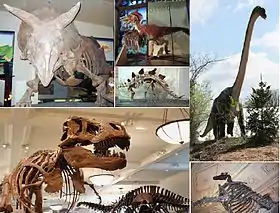 ![]() باتجاه عقارب الساعة: الترايسيراتوبس، مجسم لداينونيكوس (في الأعلى) ستيغوصور (في الأسفل)، مجسم براكيوصور، إغوانودون، أباتوصور وتيرانوصور. | |