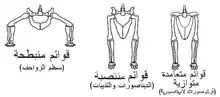 كانت الديناصورات ذات قوائم منتصبة كما معظم الثدييات المعاصرة، وبهذا فإنها تختلف عن أغلبية الزواحف الأخرى التي تمتلك قوائمًا منبطحة.[42] ويقول العلماء أن الوضعيّة المنتصبة هذه إنما هي نتيجة امتلاكها تجويفًا أفقيًا في حوضها مواجهًا للأمام يقابله نتوء داخلي كبير على عظم الفخذ.[43] سمحت هذه الوضعية للديناصورات أن تتنفس بسهولة أثناء ترحالها، الأمر الذي يُحتمل أنه سمح بازدياد قدرة تحملها ودرجة نشاطها بمقدار لا تستطيع الزواحف الأخرى "المنبطحة" الوصول إليه، بسبب بنيتها العظمية المختلفة.[44] يُحتمل أيضًا أن تكون القوائم المنتصبة قد ساعدت على نشوء وتطوّر الديناصورات العملاقة، بما أنها تخفف من الضغط على الأضلع وتقوسها الذي يتسبب به الطول والوزن الزائد.[45] كان لبعض الأركوصورات من غير الديناصورات قوائمًا منتصبة، لكنها اختلفت عن قوائم الديناصورات من ناحية أنها كانت متعامدة مع الأقدام ومتوازية مع بعضها البعض، وذلك بسبب تكوين مفصل وركها، حيث أن الحرقفة كانت تُشكل لوحًا بارزًا، بدلاً من أن تمتلك نتوءًا من عظم الفخذ يركب على محجر الورك، كما الديناصورات الحقيقية.[45]