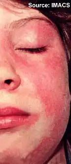 - طفح جلدي (طفح جلدي على الخدين)؛ حساسية ونوعية = 57%; حساسية ونوعية = 96%.[16]