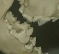 يتطابق عدد الأسنان عند كل من الذئاب الرمادية والكلاب المستأنسة. فالفك العلوي يحوي ستة قواطع، نابين، ثمانية طواحن، وأربعة أضراس، ويحوي الفك السفلي نفس عدد القواطع والأنياب والطواحن، أما بالنسبة للأضراس فيحوي ستةً منها.[27] تُشكل الطواحن الأربعة العلوية والأضراس السفلية أدوات تقطيع اللحم الأساسية. لأنياب الذئب الطويلة أيضاً أهمية كبرى، إذ أن الحيوان يستخدمها للإمساك بطريدته وإخضاعها. تُعد أسنان الذئب أسلحته وأدواته الرئيسية،[9] والذئب قادر على أن يعض بقوة تصل إلى 10,000 كيلوباسكال (1,500 رطل)، وهذا يُشكل ضعفيّ قوة عض كلب مستأنس يصل إلى ذات الحجم.[28] تُعد أسنان الذئب الرمادي مناسبةً لكسر العظام بشكل أكبر من أسنان باقي أنواع الكلبيات الباقية اليوم، على أنها ليست متخصصة بذلك كما الضباع.[29] أظهرت الدراسات أن لعاب الذئب الرمادي يخفف من نسبة الالتهابات البكتيرية في الجروح، ويُسرّع من عملية تجديد الأنسجة.[30]