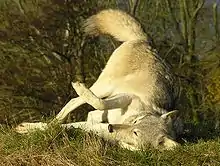 - المرح – يرفع الذئب الراغب بالمرح ذيله عالياً ويقوم بهزه، وقد يقفز من مكان لأخر، أو ينحني أرضاً عن طريق خفض القسم الأمامي من جسده ورفع الخلفي، وهزه في بعض الأحيان. يُماثل هذا السلوك سلوك اللعب عند الكلاب المستأنسة.