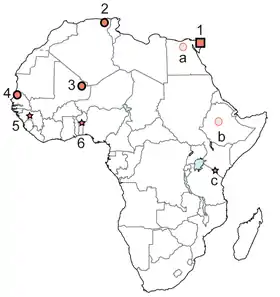 - Gaubert, Philippe; Bloch, Cécile; Benyacoub, Slim; Abdelhamid, Adnan; Pagani, Paolo; Djagoun, Chabi Adéyèmi Marc Sylvestre; Couloux, Arnaud; Dufour, Sylvain (2012-08-10). "Reviving the African Wolf Canis lupus lupaster in North and West Africa: A Mitochondrial Lineage Ranging More than 6,000 km Wide". PLoS ONE. 7 (8). doi:10.1371/journal.pone.0042740. ISSN 1932-6203. PMID 22900047. مؤرشف من الأصل في 07 نوفمبر 2015. الوسيط