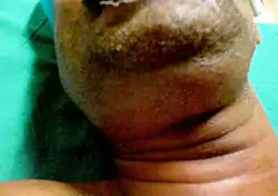 ![]() انتفاخ في منطقة الفك السفلي عند مريض مصاب بذُباح لودفيغ. انتفاخ في منطقة الفك السفلي عند مريض مصاب بذُباح لودفيغ. | |