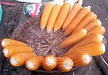 ثمرة نبتة الذرة الحلوة هي نواة الذرة، وهو نوع من الفاكهة يسمى كروبسيس. الأذن عبارة عن مجموعة من الحبات على قطعة خبز. نظرًا لأن الذرة أحادية النواة، يوجد دائمًا عدد زوجي من صفوف الحبات. الأذن مغطاة بأوراق ملفوفة بإحكام تسمى القشرة. الحرير هو اسم الأزهار التي تنبثق من القشرة. تتم إزالة القشرة والحرير يدويًا، قبل الغليان ولكن ليس بالضرورة قبل التحميص، في عملية تسمى التقشير.