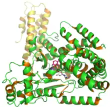 | بنية إنزيم الغلوكوزيل ترانسفيريز لذيفان ب تظهر اليوريدين ثنائي الفسفات والغلوكوز من مدخلة بنك بيانات البروتين في2BVM.[1] | |