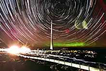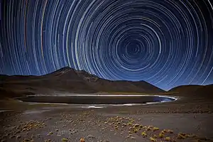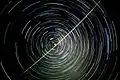 صورة للذيول النجمية تظهر الحركة النهارية للنجوم حول القطب القطب السماوي; نجم الشمال هو النجم الأسطع بقرب القطب, فوق أثر النفاسة.