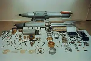قنبلة نووية بي 61 في مراحل مختلفة من التجميع ؛ والرأس الحربي النووي هو العلبة الفضية على شكل رصاصة في منتصف يسار الصورة.