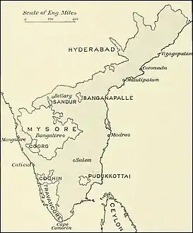 ضمت رئاسة مدراس مملكة مايسور في عام 1831 وذلك لإدعاءات سوء الإدارة وأُعيدت إلى تشاماراجا وديار (1881-1884)، حفيد وريث المومادي كريشناراجا وديار (1799-1868) في 1881. تم ضم ثانجافور في 1855، بعد وفاة شيفاجي الثاني (1832-1855) الذي لم يترك وريثاً ذكر.
