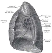 كما يوجد على السطح المنصِفِيّ وفوق السُّرَّةِ مباشرةً تلم منحني واضح للقوس الأبهري وتلم أسفل منه للأبهر النازل. يستلقي الشريان تحت الترقوة وهو فرعٌ من قوس الأبهر على تلم بدءًا من القوس حتى حوالي قمة الرئة. كما ويوجد تلم أقل عمقًا أمام الشريان السابق وقرب حافة الرئة يسكن فيه الوريد العُضُدِيّ الرأسي. قد يكون هناك انطباع ضحل عريض للمريء عند قاعدة الرئة.[4]