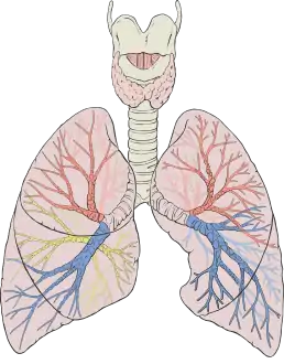 ![]() شكل يوضح الرئتين البشريتين ضمن السبيل التنفسي، وقد تم تلوين كل فص بلون مختلف عن الآخر. | |