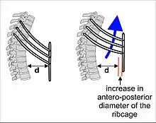 الرئة غير قادرة على توسيع نفسها، وتتَّسِعُ فقط في حالة اتساع حجم الجوف الصدري.[38] تحقِّق عضلات التنفُّس اتساعًا لجوف الصدر، من خلال تقلُّص الحجاب الحاجز والعضلات الوربية التي تسحب القفص الصدري إلى أعلى كما هو مُوضَح في الشّكل.[39] أما أثناء الزفير، فتسترخي عضلات الاستنشاق، مما يؤدي إلى عودة وضع الراحة للصدر والبطن، وذلك عبر المرونة التشريحيّة لأحشاء جوفي الصدر والبطن.[39] عند هذه المرحلة (أي بعد الزفير)، تحتوي الرئتان على السعة الباقية الوظيفيّة (الإنجليزيّة: Functional residual capacity، اختصارًا FRC) للهواء، يُقدَّر حجم السعة السابقة عند الإنسان البالغ بحوالي 2.5 إلى 3 ليتر.[39]
