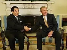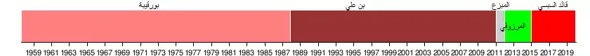 | 2 | ![]() | زين العابدين بن علي (3 سبتمبر 1936 - 19 سبتمبر 2019) | 7 نوفمبر 1987 | 14 يناير 2011 | الحزب الاشتراكي الدستوري (1987-1988) التجمع الدستوري الديمقراطي (1988-2011) | وزير داخلية ووزير أول تحت حكم بورقيبة، قام بن علي بالإنقلاب على بورقيبة في 1987 معللا ذلك بعمره البالغ وحالته الصحية التي لا تسمح له بقيادة الجمهورية. بداية من 17 ديسمبر 2010، واجه بن علي أربعة أسابيع من الاحتجاجات السلمية التي قابلها بالعنف وهي الثورة التونسية. إضطر وقتها لترك الرئاسة ومغادرة البلاد إلى السعودية وذلك في 14 يناير 2011 رفقة زوجته ليلى بن علي. |