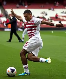 ألكس أوكسليد-تشامبرلن وهو يقوم بالحركة في الإحماء مع فريقه الآرسنال - آب 2013 م.