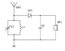 - دارة توليف قادرة على اختيار التردد المرغوب لمحطة الراديو من بين جميع الترددات التي يتم استقبالها من قبل الهوائي، وترفض بقية الترددات. هذه الدارة تتألف من ملف كهربائي ومكثف موصولين على التفرع لذلك هي تشكل دارة طنين عند اردد المحطة المرغوبة وبذلك يتم التوليف. أي من المكثف أو الملف يمكن أن يكون قابلا للضبط (أي تغيير قيمته الفيزيائية) مما يسمح للدارة بالتوليف على ترددات مختلفة.