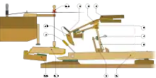 يمثل مفتاح البيانو أيضًا رافعة مركبة من النوع 1، حيث تنتقل القوة من إصبع العازف إلى المطرقة أعلى الوتر. فالغرض الرئيسي من هذه الرافعة الخاصة هو تحويل الحركة الصغيرة التي يقوم بها العازف على المفتاح إلى حركة أكبر وأسرع على المطرقة أعلى الوتر.[5]