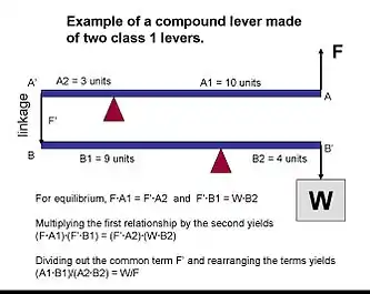 في الصورة الموضحة على اليسار، تتكون هذه الرافعة المركبة من رافعتين من النوع 1، وتوضح المعادلات خطوات حساب القوة تدريجًا من القوة الأولى المؤثرة (F) حتى تنتقل بعد تكبيرها إلى النقطة (A')، وتنتقل بالتبعية إلى (B)، وبعد ذلك تصبح القوة التي تمت مضاعفتها من القوة الأصلية (F) في الذراع الأول لتصبح (F')، والتي انتقلت كما هي من نقطة (A') إلى (B') من خلال وصلة فقط دون رافعة، أصبحت هي القوة المدخلة إلى الذراع الثاني، والذي سيعمل بدوره على مضافتها من (F') إلى (W). ولحساب الفائدة الميكانيكية هنا باستخدام الأبعاد الموضحة في الصورة، نقسم القوة المستفادة في نهاية الرافعة المركبة (W) إلى القوة الأصلية التي أثرنا بها في بداية الرافعة المركبة (F)، وعليه فإن: الفائدة المركبة = 9 × 103 × 4 = 7.5، مما يعني أنه إذا أثرنا بقوة تساوي (1 نيوتن)، سنتمكن من رفع ثقل له وزن (7.5 نيوتن) وذلك باستخدام الرافعة المركبة.