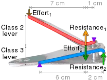 تقاس المسافات العمودية على القوة في حساب الفائدة الميكانيكية. في مثال قصافة الأظافر (رافعة مركبة من رافعتين (إحداهما من النوع 2، والأخرى من النوع 3) نجد أن القوة المؤثرة تكون رأسية، أي ليست عمودية على الذراع المائل، لذا نستخدم المسافات الأفقية لحساب الفائدة الميكانيكة. في هذا المثال تساوي الفائدة الميكانيكية W/F، أي تساوي (7 + 1) × 61 × (6 + 2) = 6.