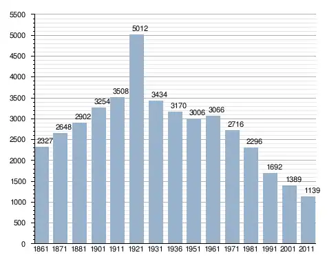 في سنة 1861 بلغ عدد السكان 2٬327 نسمة، وتطور العدد ليصل في سنة 2011 لـ 1٬139 نسمة.
