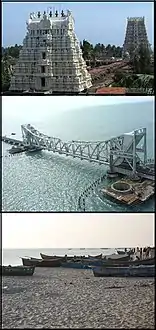 ![]() تظهر الصورة المعبد والجسر وقوارب الصيد من أعلى إلى أسفل. من أعلى: برج معبد راماناثاسوامي، جسر بامبان، ومجموعة من قوارب الصيد. | |