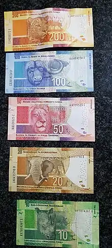 | العملات الورقية | 10، 20، 50 ، 100، 200 راند | |||