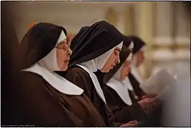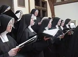 راهبات مسيحيات في زي الراهبات الرسمي، ينشدن التراتيل