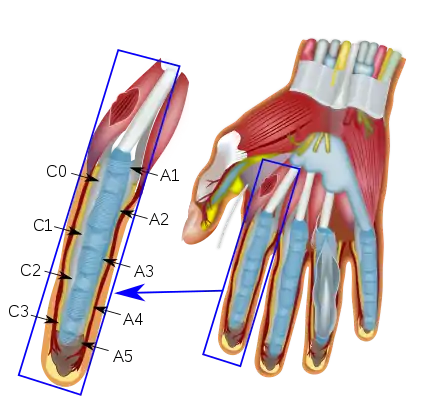- في الأصابع ، تمر أوتار العضلات المثنية السطحية والعميقة عبر نظام نفق ليفي عظمي من الأربطة الحلقيّة والصليبيّة تسمى البكرات pulleys. تربط البكرات الصليبية بالأوتار المثنية الطويلة. يختلف عدد ومدى هذه الأربطة الصليبية والحلقية بين الأفراد ، ولكن عادةً ما توجد ثلاثة أربطة صليبية وأربعة أو خمسة أربطة حلقية في كل إصبع (يشار إليها عادةً باسم "بكرة A1" و "بكرة C1"). يمتلك الإبهام نظامًا مشابهًا بالنسبة للوتر المثني الطويل الخاص به ولكن مع بكرة مائلة واحدة single oblique pulley تحل محل البكرات الصليبية cruciate pulleys الموجودة في الأصابع.