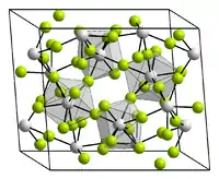 a = 1273 pm, b = 1075 pm, c = 843 pm, β = 126° مع وجود اثنتا عشر وحدة صيغة لكل وحدة خلية.[4]