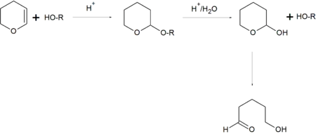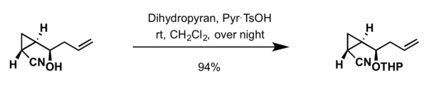 يعالج الكحول مثلاً بثنائي هيدرو البيران (THP) وبارا-تولوين حمض السلفونيك (TsOH) في وسط من ثنائي كلورو الميثان عند درجة حرارة معتدلة.[8][9]