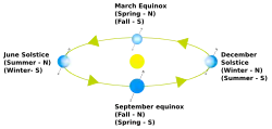 - في هذه الفترة، وتبعًا للتاريخ الجيولوجي للأرض، تتخذ الأرض مداراً تكون فيه أكثر ميلاً نحو النصف الجنوبي من العالم حيث تبدأ مواسم الأرض الأكثر دفئاً